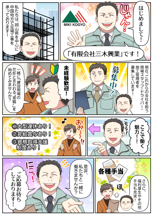 募集職種 | ・足場工事の組立・解体作業スタッフ ・大型ドライバー ・施工管理者 |